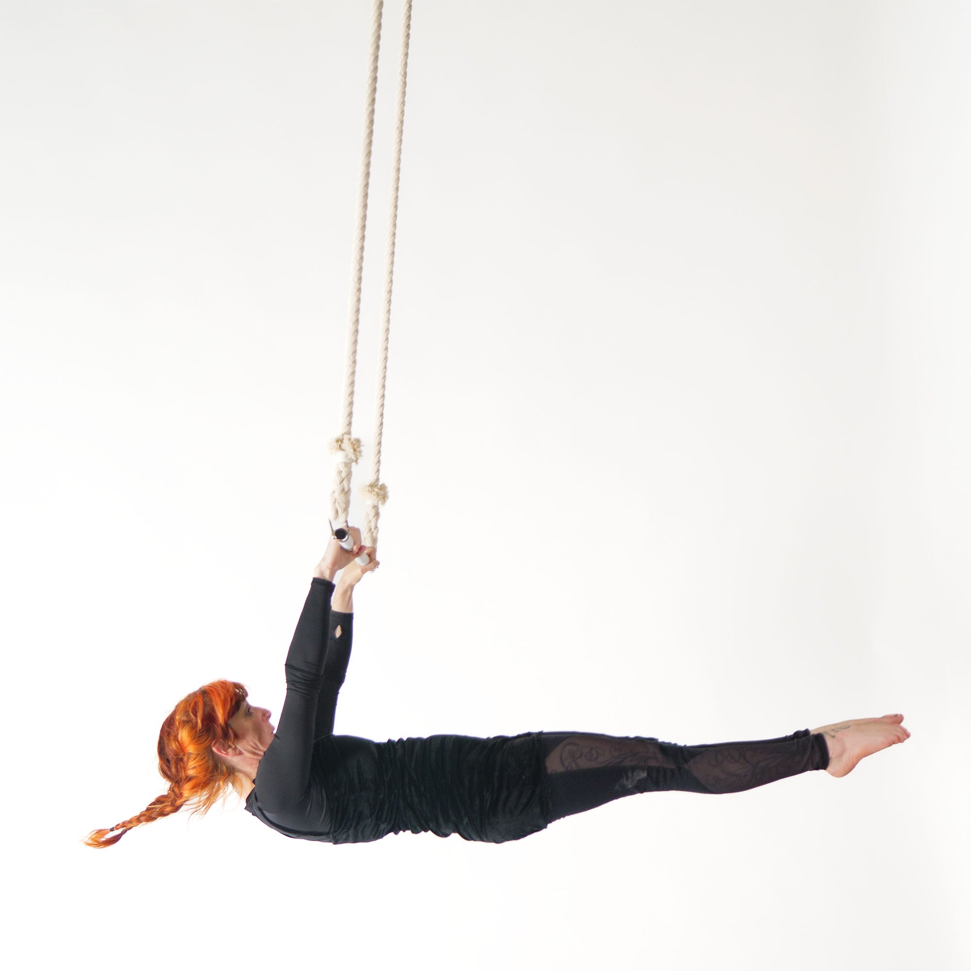 Shackle trapezes have the benefit of greater mobility and the ability to switch out the ropes or bar. They move with more ease and can take a bit of time to get used to. The fixed thimble trapezes will feel a little more secure but the more rigid elbows can make the trapeze feel less compliant. They also have a heavier bar than the shackle style making rope moves a little harder.