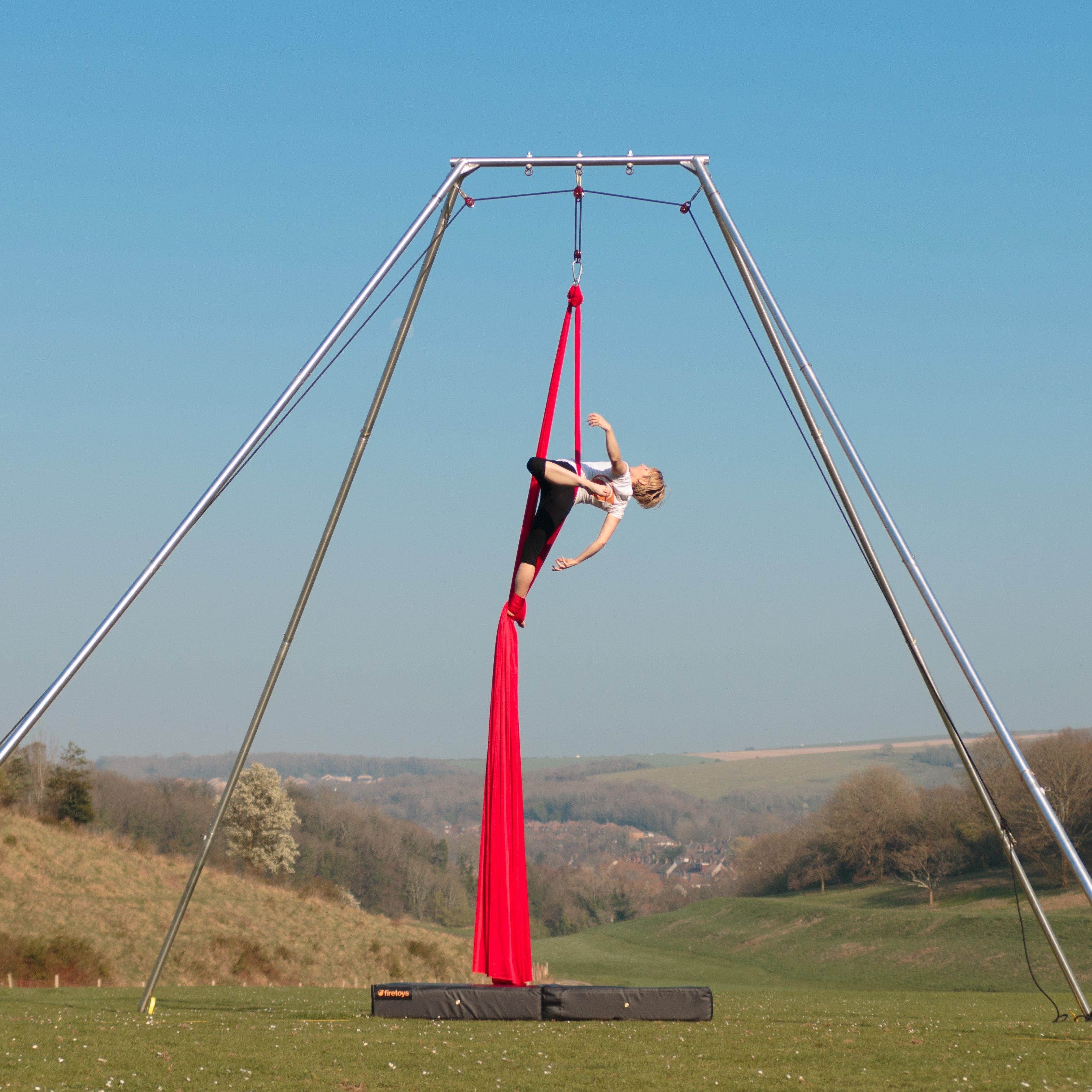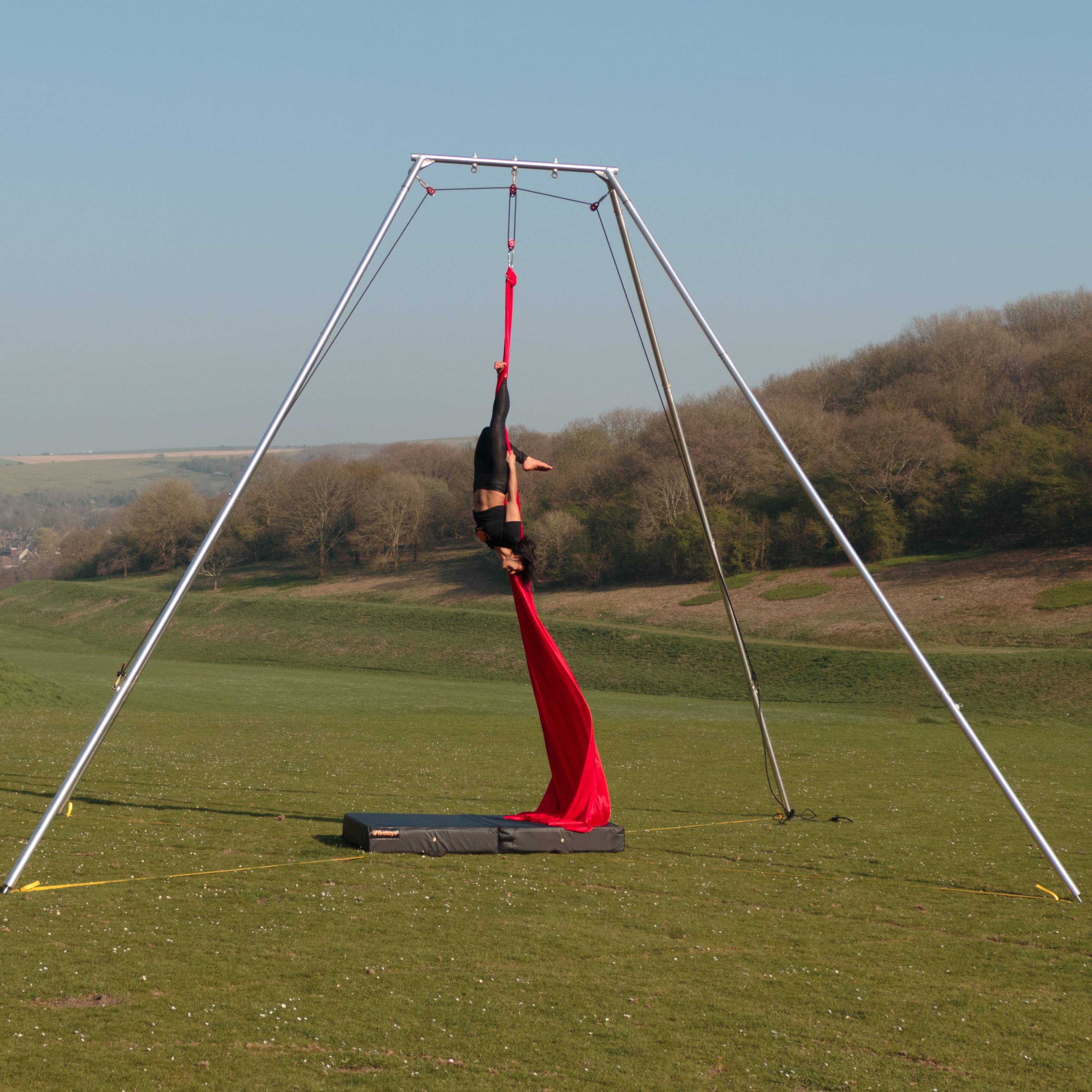 The short answer to “can I rig my aerial circus equipment from a tree?” is “no”. Firetoys strongly recommends you do not rig from trees on safety grounds. It is a much better and safer option to invest in an outdoor (or even indoor) aerial rig to practice from in the convenience of your back garden or local park.