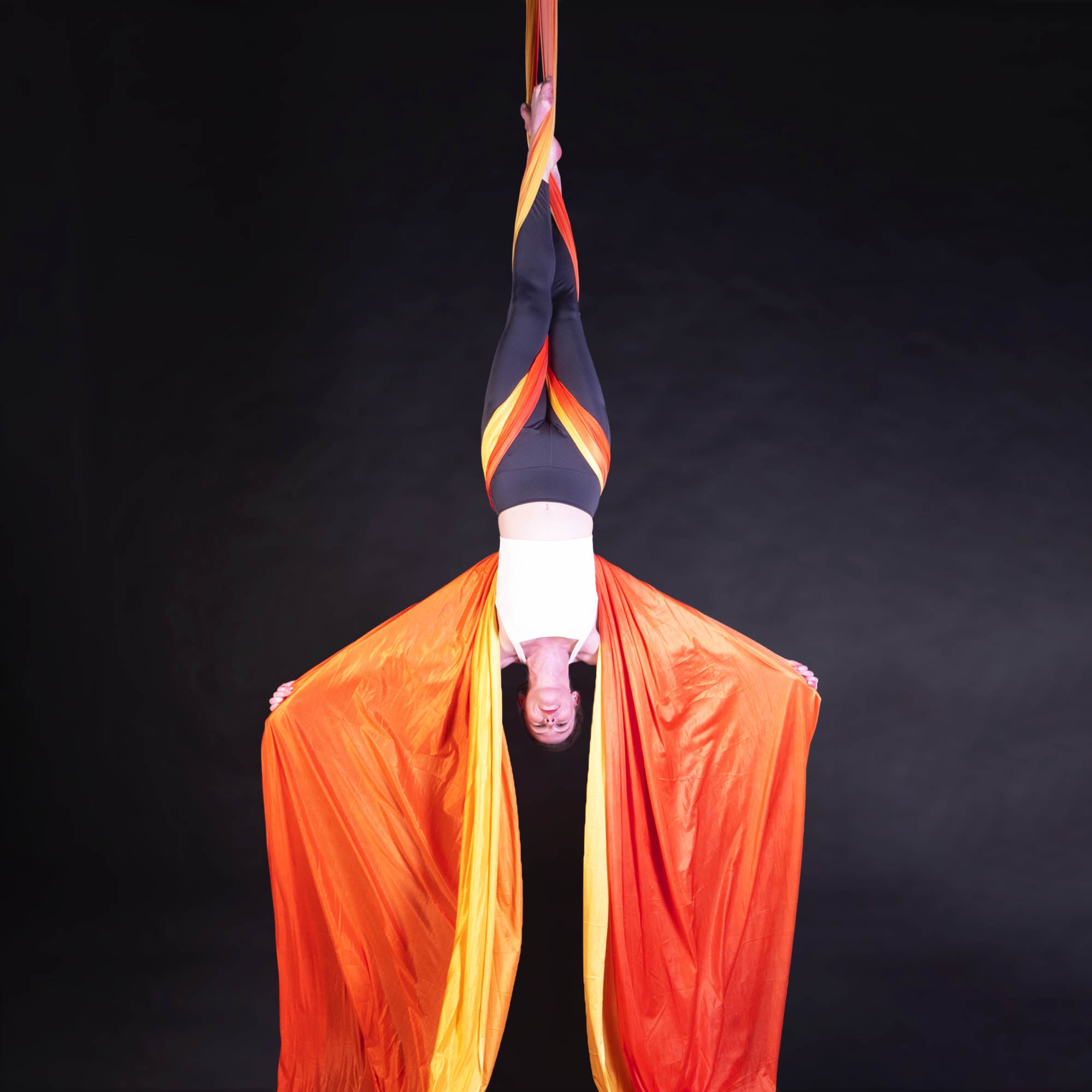 These beautiful fabrics are a 40 denier, warp knit (tricot), 100% nylon aerial silk (also known as aerial fabric, tissus, or ribbon).