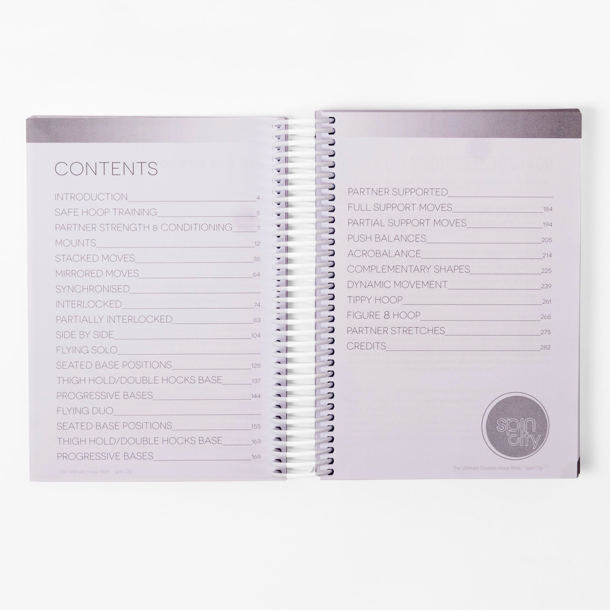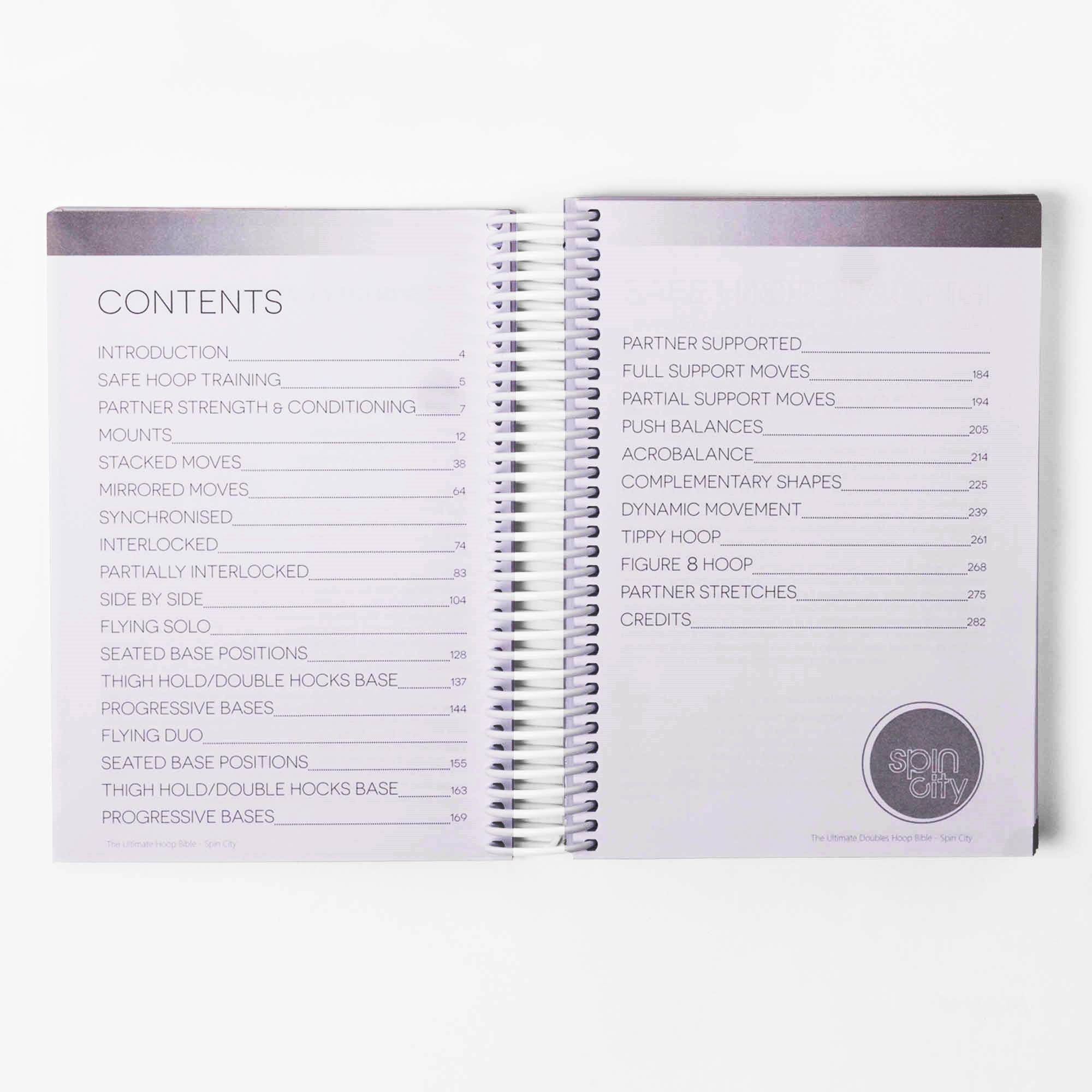 The Spin City Doubles Hoop Bible (2nd edition) is an extensive guide that boasts over 800 photographs and 250 pages. It is the perfect companion for anyone who wants to enjoy the fun of aerial hoop with a friend.