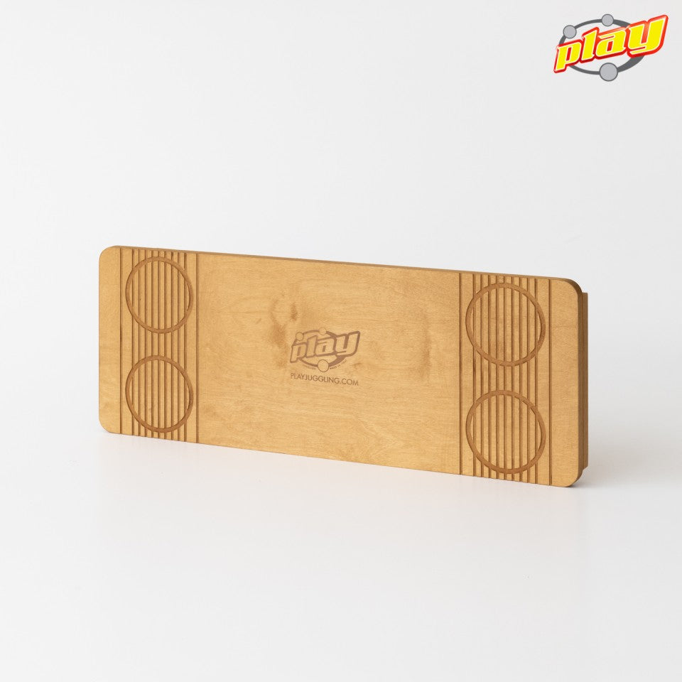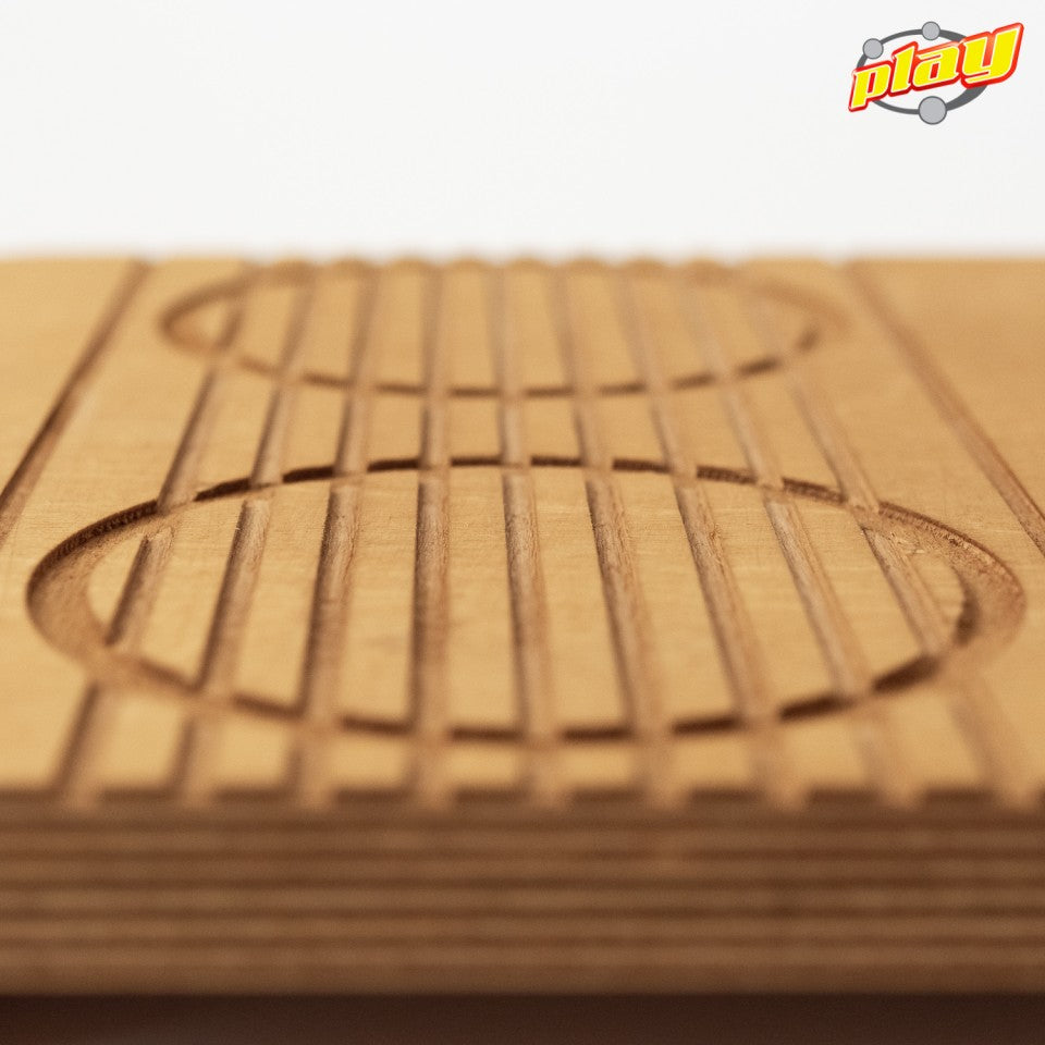 This plywood board is designed to fit with any play rolla. The board is equipped with four circular grooves in each corner, which enables the stacking of cylinders to create a multi-level Rolla Bolla.