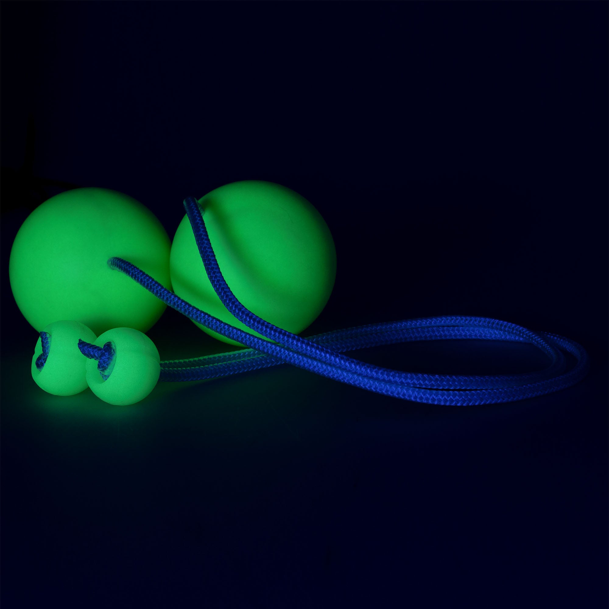 An eye-catching and professional pair of contact poi, with 90mm glow-in-the-dark balls, and glow-in-the-dark Pro Silicone Poi Handles!