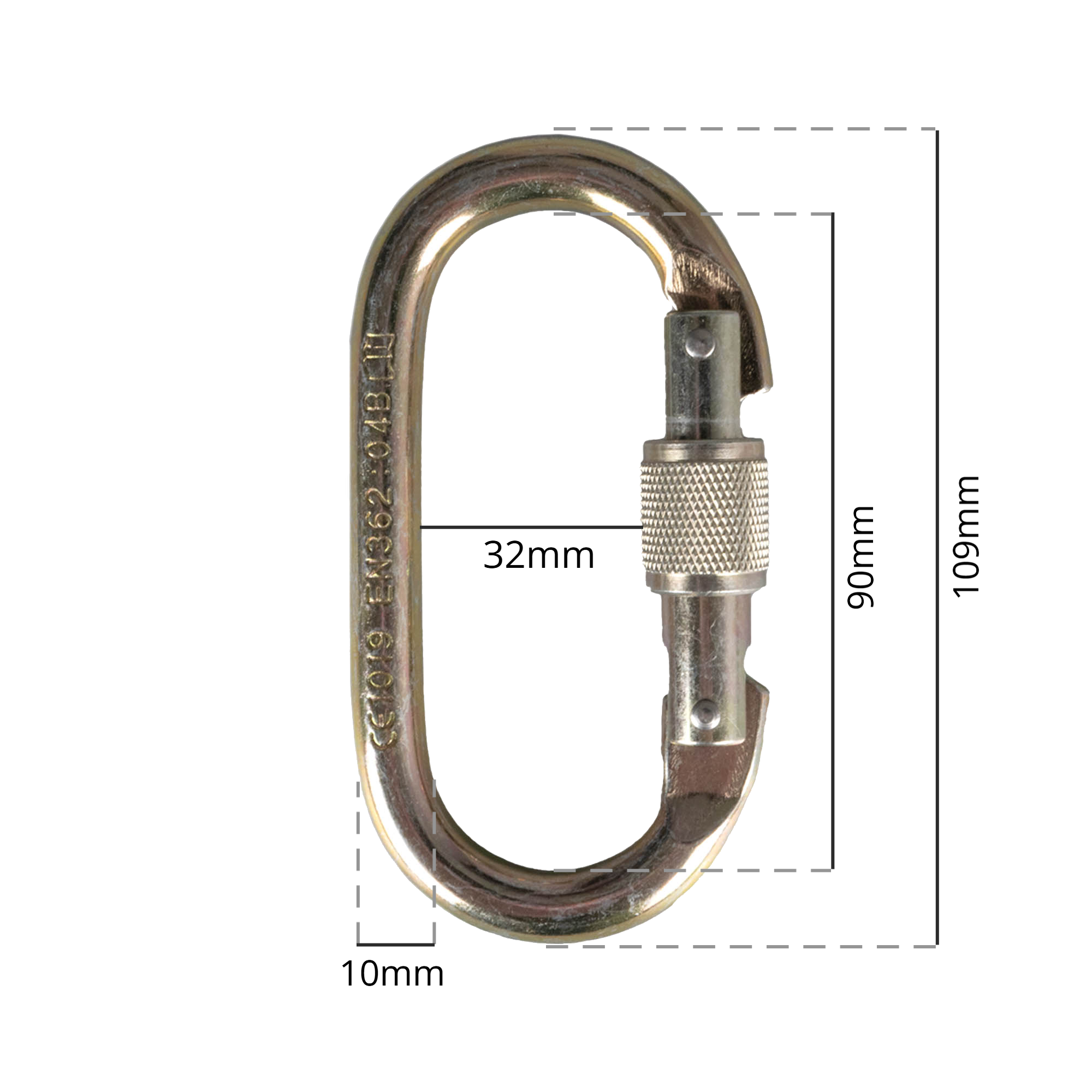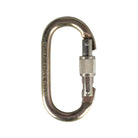 A steel oval-shaped carabiner featuring a screw-locking gate.